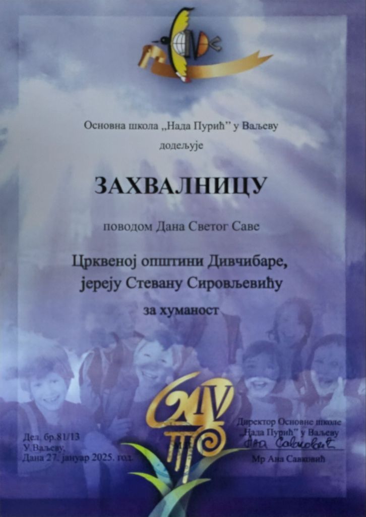 У Основној школи „Нада Пурић“ у Ваљеву свештеник је у име Црквене општине Дивчибаре присуствовао резању славског колача и приредби. Том приликом, примио је захвалницу за подршку и помоћ раду специјалног одељења у овој школи коју пружа ова црквена општина.
